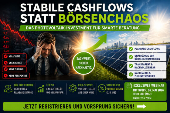 Die aktuellen Marktbedingungen fordern den Vertrieb mehr denn je: volatile Kapitalmärkte, verunsicherte Anleger und eine Vielzahl komplexer, schwer greifbarer Produkte machen es zunehmend anspruchsvoll, Kunden überzeugend zu beraten und nachhaltig zu binden. Genau hier setzen wir an. In unserem exklusiven Webinar zeigen wir Ihnen ein neues, praxiserprobtes Photovoltaik-Investmentmodell, das Sie sofort in Ihre Beratung integrieren…