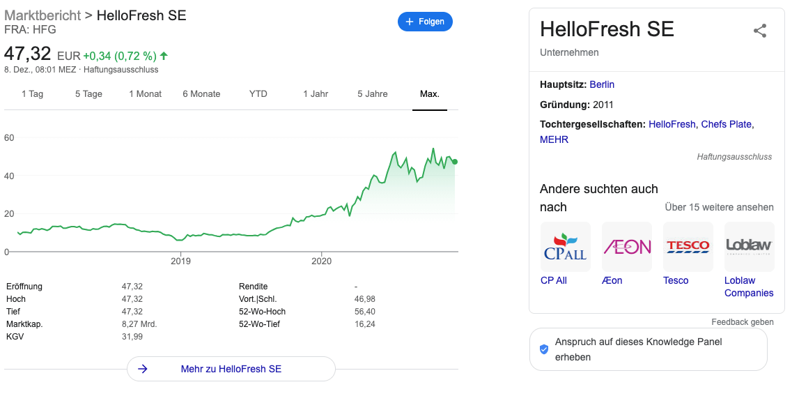 Die Entwicklung geht auf dem Börsenparkett mitnichten spurlos vorbei. Binnen eines Jahres stieg der Preis der Hello Fresh Aktien um 229,1 Prozent. Im selben Zeitraum büßte der DAX sogar leicht an Notierung ein.