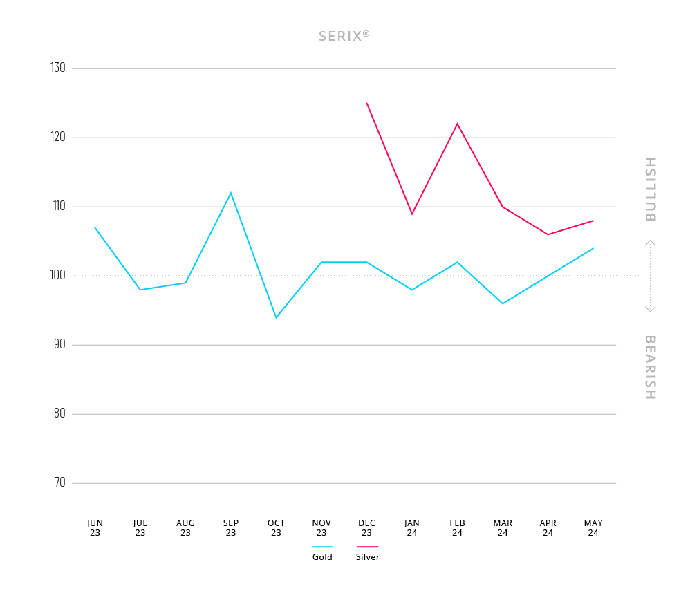 Auch Silber erreichte Ende Mai ein Rekordhoch von 32,391 US-Dollar pro Unze[2]. Die Privatanleger blieben jedoch optimistisch und der SERIX für Silber endete im Monatsverlauf bei 108 Punkten. Seit der Einführung von Produkten mit Silber als Basiswert für den Handel auf Spectrum im Dezember 2023 war die Stimmung gegenüber dem Edelmetall durchweg positiv, beginnend mit einem SERIX-Spitzenwert von 125 Punkten.