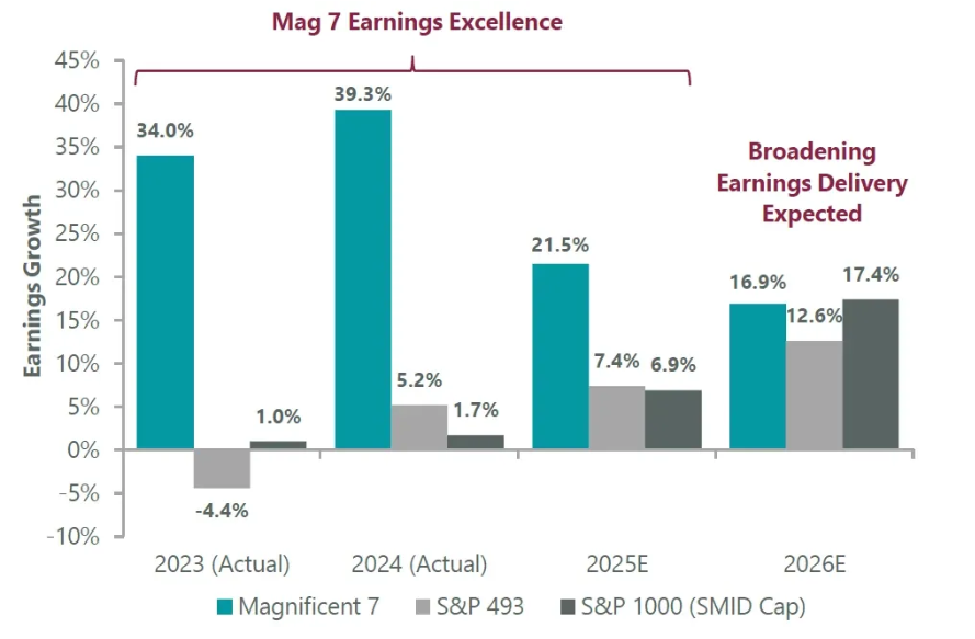 Da die verbesserten fundamentalen Aussichten nicht nur auf KI zurückzuführen sind, dürfte 2026 eine größere Gruppe von Unternehmen davon profitieren. Die EPS-Erwartungen der Sell-Side zeigen eine Ausweitung, wobei der S&P 493 und kleine und mittelständische Unternehmen im S&P 1000 Index bereit sind, die Lücke zu den Magnificent Seven in Bezug auf die Gewinnentwicklung im Jahr 2026 zu schließen. Da sich der EPS-Wachstumsvorteil der Magnificent Seven verringert, könnte sich die Marktführerschaft auf weniger teuer bewertete Nachzügler dieses Zyklus wie SMID-Cap- und Value-Unternehmen verlagern, die relativ gesehen aufholen.