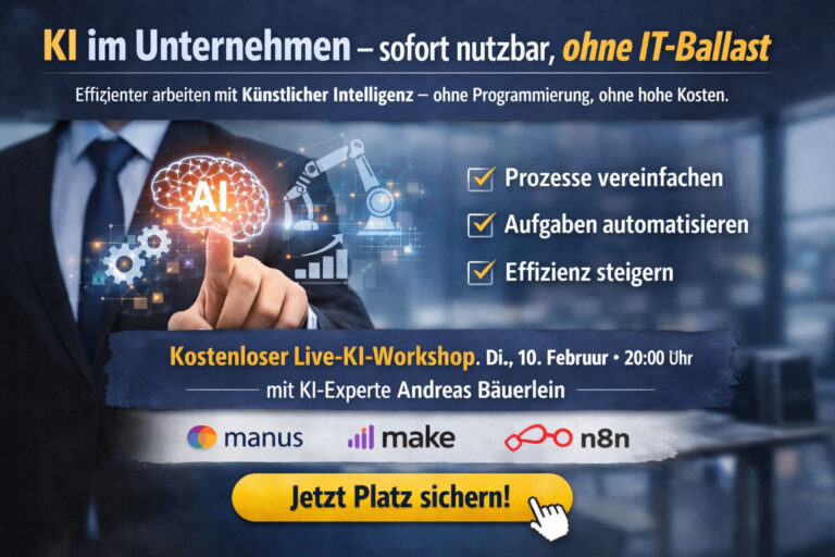 Wie Sie innerhalb kurzer Zeit erste wirksame KI Lösungen in Ihrem Unternehmen implementieren, erfahren Sie im kostenlosen Live KI Online Workshop am Dienstag, 10. Februar um 20:00 Uhr mit dem KI Experten Andreas Bäuerlein.