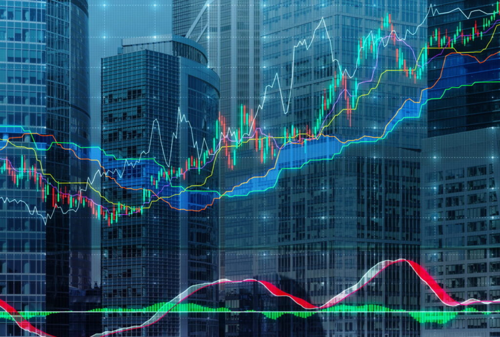 Forex chart over the background of the skyscrapers of the International Business Centre in Moscow, Russia.