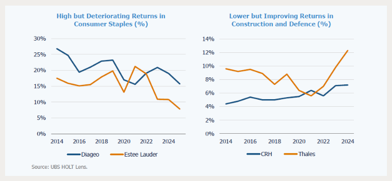 Anleger, die nach „Qualität“ suchen, neigen oft dazu, einfache, leicht zu filternde und rückwärtsgerichtete Kennzahlen – etwa die Rendite auf das investierte Kapital (ROIC) – mit einem echten Verständnis für die Dauerhaftigkeit der Wettbewerbsposition eines Unternehmens gleichzusetzen. Letzteres ist jedoch naturgemäß komplex und in hohem Maße qualitativer Natur. Die Kapitalrendite ist bestenfalls ein Indikator für Qualität: Sie liefert Hinweise, aber niemals Beweise dafür, welche Unternehmen wirklich über Preissetzungsmacht, Wettbewerbsvorteile und die Fähigkeit verfügen, über die Zeit hinweg Wertzuwächse zu kumulieren. Wir würden zudem argumentieren, dass Richtung und Tempo der Veränderung der Kapitalrendite eines Unternehmens ebenso wichtig sind wie ihr zuletzt ausgewiesenes Niveau. Anders ausgedrückt: Marginale Kapitalrenditen können genauso wichtig sein wie historische.