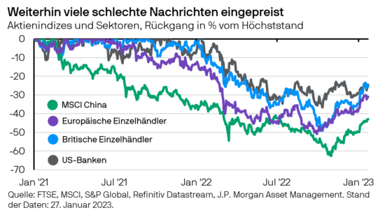 Aktien sowohl der Industrie- als auch der Schwellenländer haben sich von ihren Tiefständen im Oktober 2022 erholt, da sinkende Gaspreise und das Ende von Chinas Null-Covid-Politik zu weltweit besseren Wirtschaftsaussichten beitrugen. Unseres Erachtens sind aber noch viele schlechte Nachrichten eingepreist. Chinesische Aktien liegen weiterhin etwa 40 % unter ihrem Höchststand, obwohl sie seit ihrem Tief im…