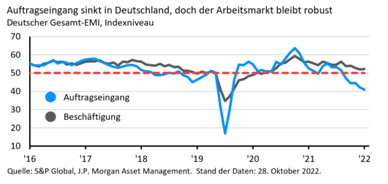 Der vorläufige Gesamt-Einkaufsmanagerindex (EMI) in Deutschland fiel im Oktober auf 44,1, den niedrigsten Stand seit Mai 2020. Der Auftragseingang war mit 40,9 besonders schwach, ein Indiz für das schlechtere Geschäftsklima und die schwächere Nachfrage, da sich der Konjunkturausblick weiter eintrübt. Die Beschäftigungskomponente blieb mit 52,2 jedoch klar im expansiven Bereich, da die Firmen bereit waren,…