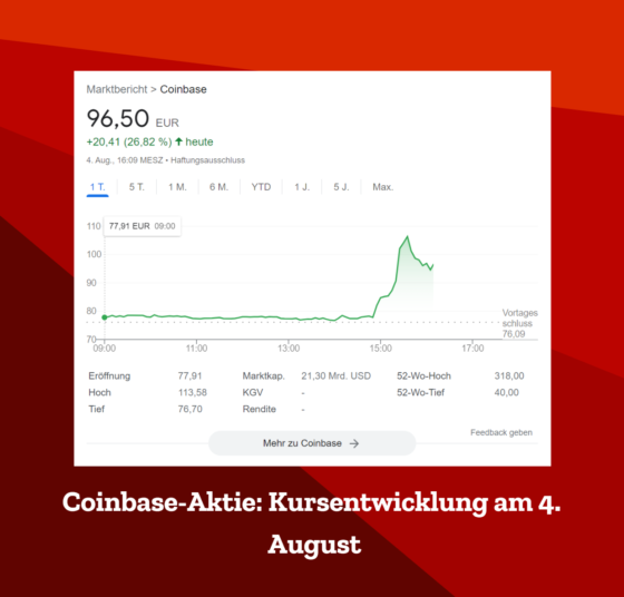 An diesem Donnerstag notierten die Coinbase Aktien zwischenzeitlich bei 106,34 Euro – zum Börsenstart um 09:00 Uhr konnten Anleger die Krypto Aktie noch für 77,91 Euro erwerben. Der Zugewinn binnen weniger Stunden schlägt mit rund 36 Prozent zu Buche. Doch was steckt dahinter? Die Kursexplosion lässt sich darauf zurückführen, dass die Krypto-Börse Coinbase sowie der Vermögensverwalter BlackRock…