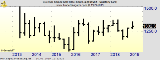 Trend des Wochencharts: Aufwärts Der abgebildete Wochenchart (mit logarithmischer Skalierung) zeigt die Kursentwicklung des in New York gehandelten Gold-Futures (GC) seit Ende 2017 bei einem letzten Kurs von $1.313,4. Ausgehend von dem im August 2018 erreichten Vorjahrestief bei $1.167,1 liegt im Wochenchart ein etablierter Aufwärtstrend vor, der durch steigende Tiefpunkte und steigende Hochpunkte charakterisiert ist. Im Februar…