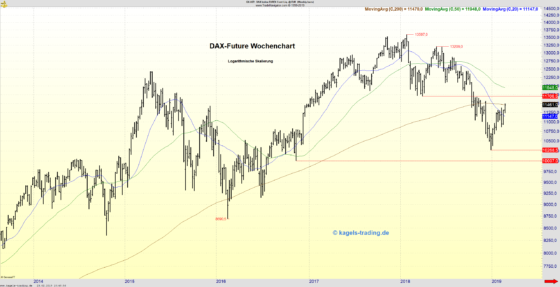 Trend des Wochencharts: Aufwärts/Seitwärts Der abgebildete Wochenchart des DAX-Future (logarithmische Skalierung) zeigt die Kursentwicklung seit Ende 2014, bei einem letzten Kurs von 11.461 Punkten. DAX-Future erreicht 200 Wochen Gleitenden Durchschnitt DAX-Future erreicht neues Jahreshoch Der DAX-Future hat ausgehend vom Vorjahrestief bei 10.268,5 Zählern einen definierten Aufwärtstrend entwickelt und in der vergangenen Woche ein neues Jahreshoch bei…