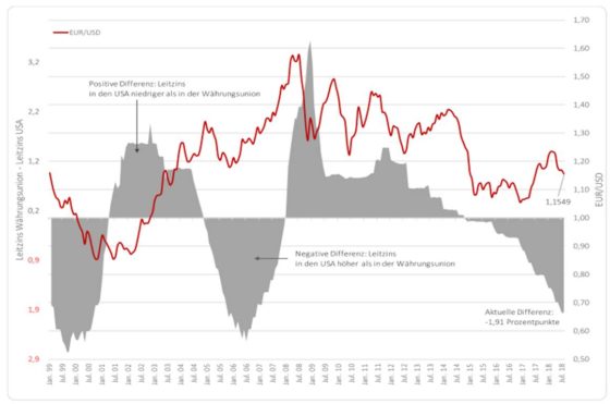 Aufgrund der engen Handelsbeziehungen zwischen Europa und den USA ist der EUR/USD-Kurs für viele Unternehmen von hoher Bedeutung. Anhand einiger makroökonomischer Parameter wird versucht Vorhersagen über den Verlauf des Wechselkurses zu machen. Eine wichtige Rolle spielen dabei die Notenbanken und ihre Geldpolitik. Der Zinskorridor in den USA liegt aktuell bei 2 und 2,25 Prozent. In…