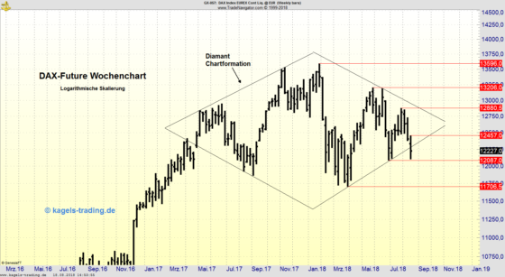 Trend des Wochenchart: Abwärts Der abgebildete Wochenchart des DAX-Future (logarithmische Skalierung) zeigt die Kursentwicklung seit April 2016, bei einem letzten Kurs von 12.227 Punkten. In der vergangenen Woche hat es eine abwärts gerichtete Trendkerze gegeben und der DAX-Future nähert sich der 12000 Punkte Marke. DAX-Future in großer Diamant Chartformation Hier klicken und DAX-Future Handelssignale 14 Tage testen!…