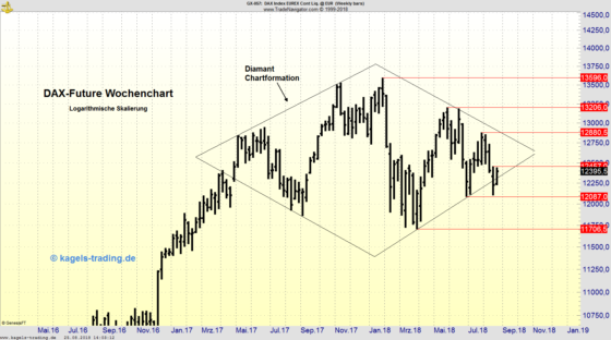 Trend des Wochenchart: Abwärts/Seitwärts Der abgebildete Wochenchart des DAX-Future (logarithmische Skalierung) zeigt die Kursentwicklung seit April 2016, bei einem letzten Kurs von 12.395,5 Punkten. In der vergangenen Woche hat es eine abwärts gerichtete Trendkerze gegeben und der DAX-Future nähert sich der 12000 Punkte Marke. DAX-Future in großer Diamant Chartformation Hier klicken und DAX-Future Handelssignale 14 Tage testen!…