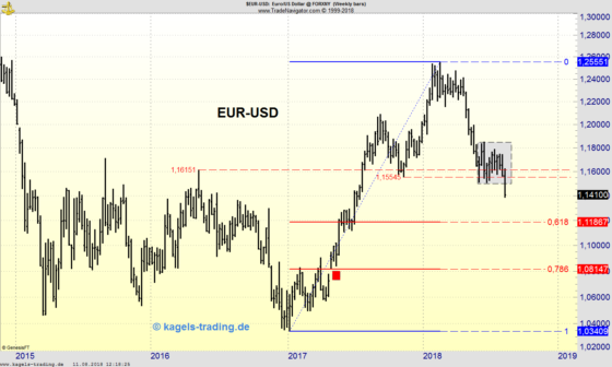 Trend des Wochenchart: Abwärts Der abgebildete Wochenchart des Währungspaares Euro/Dollar (EUR/USD Forex) zeigt die Kursbewegung seit Januar 2015. Jeder Kursstab stellt die Kursentwicklung für eine Woche dar, bei einem letzten Kurs von 1,1410. EUR-USD im Abwärtstrend EUR/USD bricht aus Konsolidierung nach unten aus Aus Sicht des Wochencharts ist EUR/USD in der vergangenen Woche aus einer…