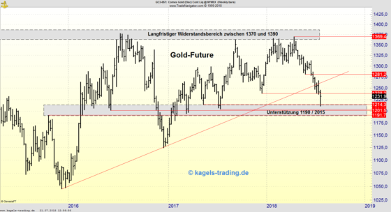 Trend des Wochencharts: Abwärts Goldpreis im Abwärtstrend Goldpreis im etablierten Abwärtstrend Der Goldpeis bewegt sich ausgehend von dem Jahreshoch bei $1369,4 in einem mehrfach bestätigten Abwärtstrend. Grundsätzlich kann somit von einer Fortsetzung der Abwärtsbewegung ausgegangen werden und das nächste Kursziel könnte das Julitief 2017 bei $1204 sein Goldpreis zum Wochenschluss deutlich erholt. Der abgebildete Wochenchart…