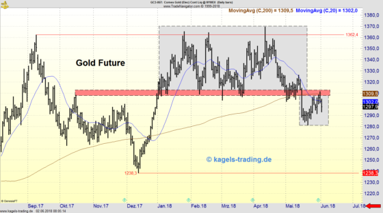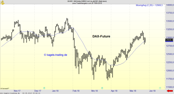 Trend des Tagescharts: Aufwärts/Korrektur Der abgebildete Tageschart des DAX-Future zeigt die Kursentwicklung seit November 2017 bei einem letzten Kurs von 12.930,5 Punkten. Wir blicken auf einen etablierten Aufwärtstrend, nachdem es in den letzten Wochen ausgehend von dem Märztief bei 11.706,5 eine kräftige Aufwärtsbewegung gegeben hat. Ausgehend vom aktuellen Maihoch bei 13.206 hat es in den letzten drei…