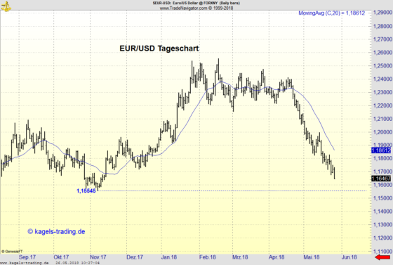 Trend des Tageschart: Abwärts Der abgebildete Tageschart des Währungspaares Euro/Dollar (EUR/USD Forex) zeigt die Kursbewegung seit Oktober 2017. Jede Kurskerze (Candlestick) stellt die Kursentwicklung für einen Tag dar, bei einem aktuellen Kurs von 1,1646. EUR-USD im Abwärtstrend Hier klicken und EUR-USD Handelssignale 14 Tage testen! EUR/USD im Abwärtstrend Aus Sicht des Tagescharts befindet sich das…